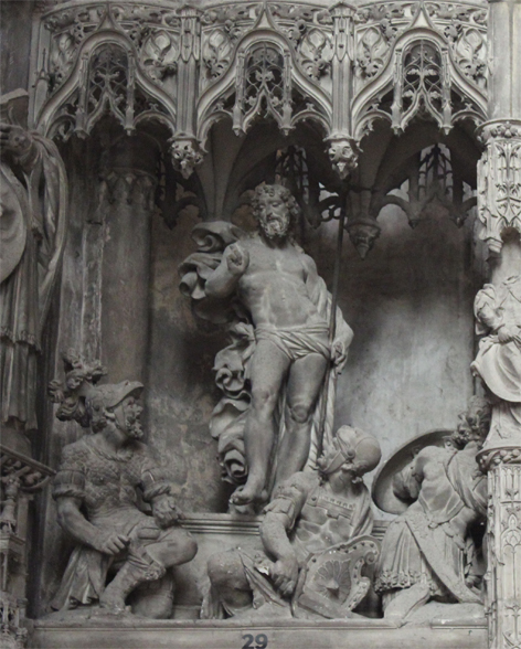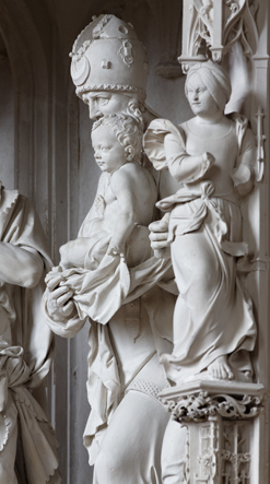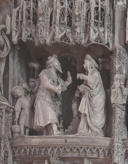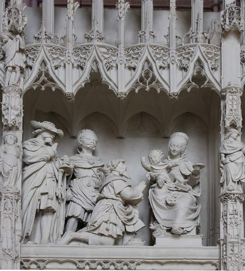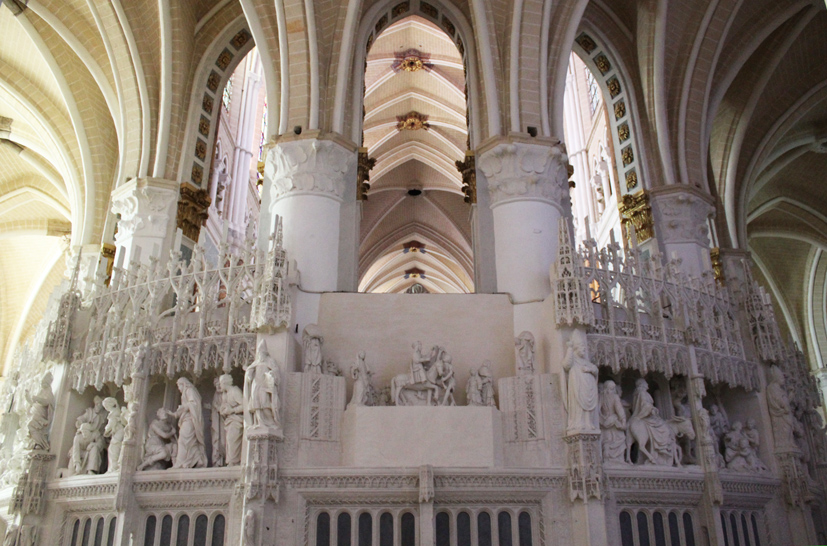 C’est la première travée Renaissance du Tour de chœur ; elle est marquée par de nombreux éléments décoratifs caractéristiques : coquilles, putti, portraits en médaillon, candélabres.