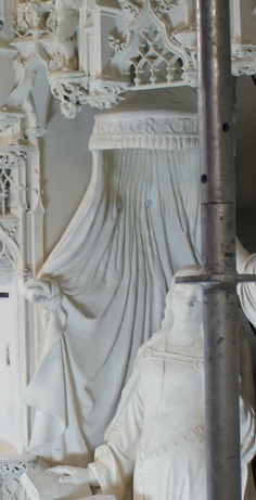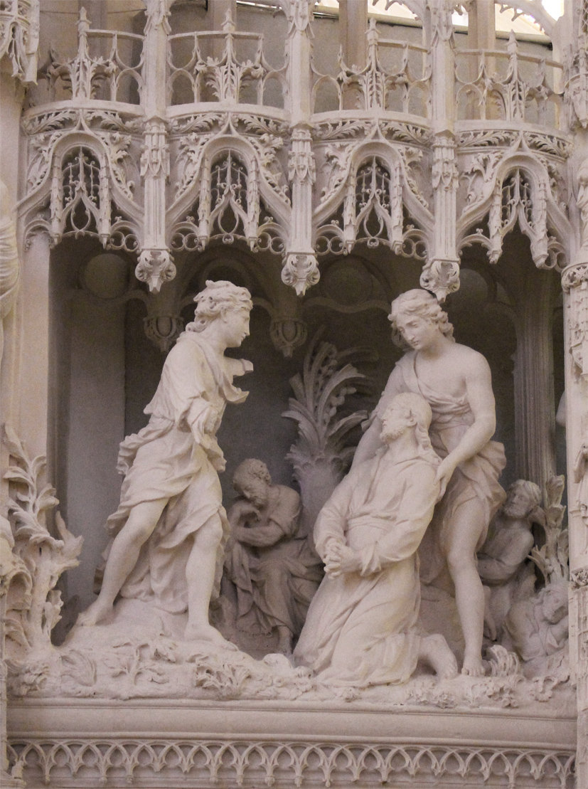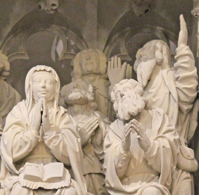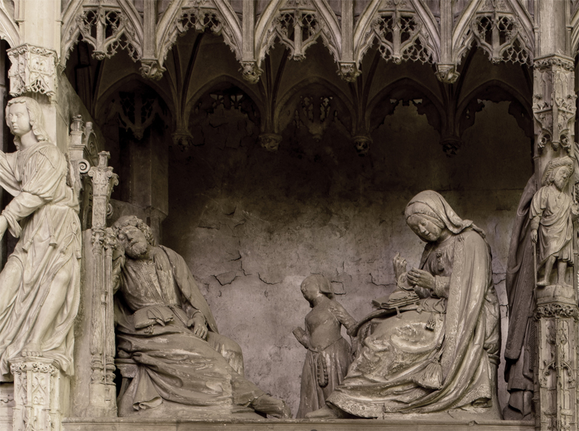 « Joseph, fils de David, ne crains pas de prendre chez toi Marie ton épouse : l’enfant qui est engendré en elle vient de l’Esprit Saint » (Mt I -18-21). Marie est occupée à coudre ; son visage penché sur son ouvrage est plein de douceur (photo de droite). L’arrière-plan est étrangement vide, sans doute en raison des modifications apportées lors de l’aménagement du chœur canonial au XVIIIe siècle. En revanche, les retombées des voûtes postérieures du baldaquin, bien visibles ici, permettent d’imaginer la clôture dans son état primitif.