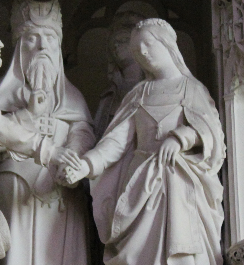 Le grand prêtre bénit l'union de Marie et Joseph. A l'arrière et de part et d'autre sont les témoins. Le sculpteur a su transcrire dans la pierre l'extrême jeunesse de Marie qui, selon la tradition, devait avoir environ quatorze ans (photo de droite). Noter le geste de Marie relevant délicatement son magnifique manteau brodé de petites roses.