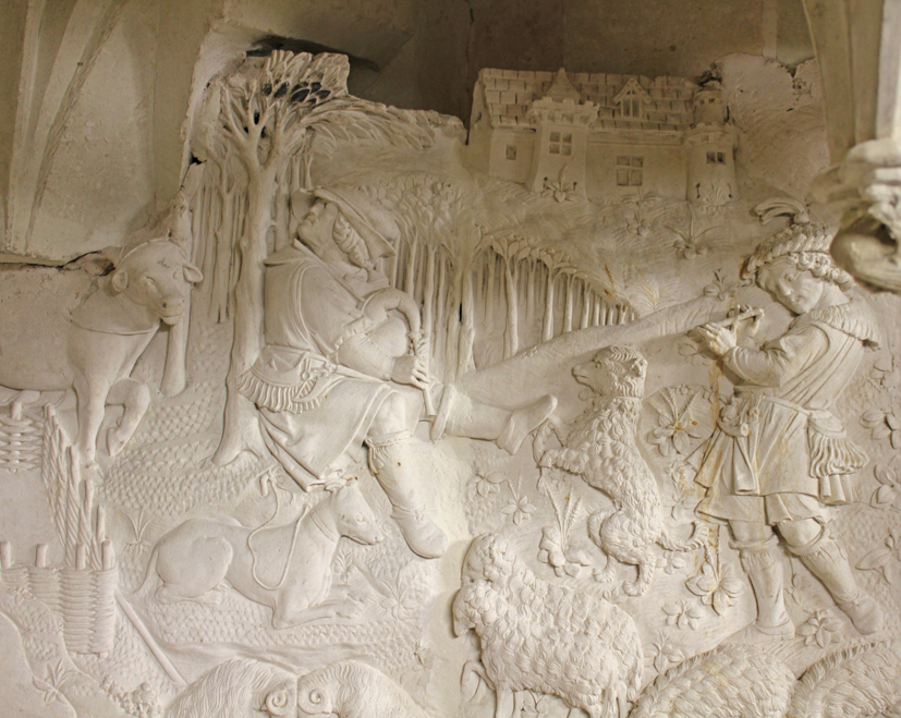 l’épaule ; elle prie devant l’enfant Jésus couché dans un panier d’osier ; trois angelots paraissent se réjouir tandis que Joseph se tient debout en retrait. L’Annonce aux bergers est figurée en bas-relief sur le pilier du côté droit (photo de droite) : scène champêtre très animée montrant les bergers et leurs troupeaux.