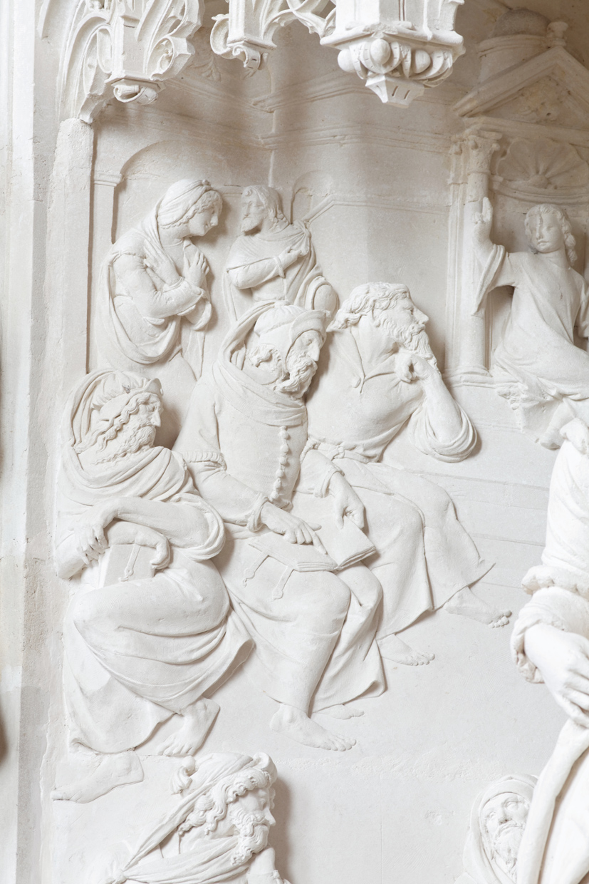 précédée d’un bas-relief montrant Jésus à l’âge de douze ans s’entretenant dans le temple avec les docteurs de la loi (photo de droite).