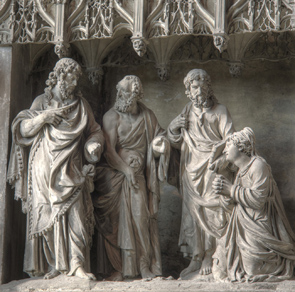 Un jour, des Pharisiens amènent à Jésus une femme prise en flagrant délit d’adultère. Ils veulent la faire lapider en punition de sa faute et demandent l’approbation de Jésus. Or, Jésus leur dit : « celui d’entre vous qui est sans péché, qu’il soit le premier à lui jeter la pierre ». Alors les Pharisiens s’en allèrent. La beauté et l’humilité de la femme (photo de droite) retiennent l’attention face à l’agressivité qui se lit dans le regard des Pharisiens.