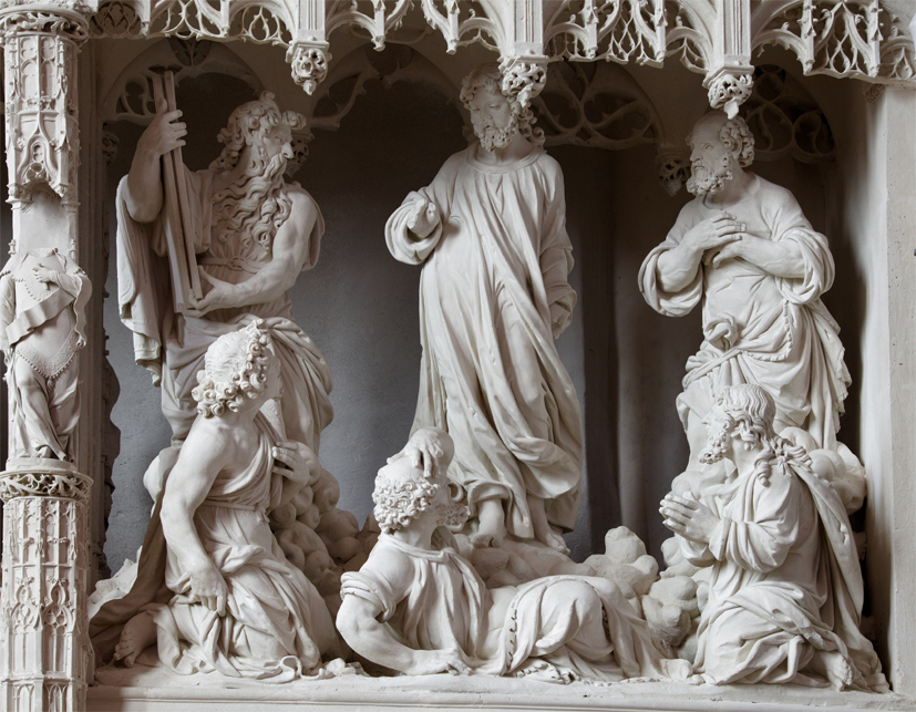 Au cours du XVIe siècle, le style glisse du gothique flamboyant à celui de la Renaissance qui se caractérise notamment par le rendu de l’anatomie, le mouvement des corps, l’expression des visages, le réalisme. Ces éléments contribuent à donner à cette scène une intensité dramatique. Ce groupe sculpté a subi des mutilations malheureusement irréversibles. Sur le pilier, une Fuite en Égypte, exécutée en bas-relief (photo de droite).
