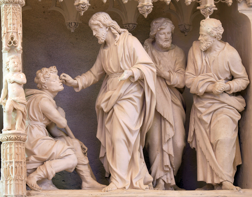 Jésus rencontre un mendiant aveugle de naissance et lui rend la vue en déposant sur ses yeux un peu de boue délayée avec sa salive. Ce miracle illustre la mansuétude divine face à l'attitude d’abandon et de confiance de l’aveugle (photo de droite). La scène dans sa globalité parait prise sur le vif : les deux disciples témoins de la compassion du Christ commentent le miracle tout en marchant (genoux fléchis, mouvement des lourds drapés de leurs vêtements, beaux visages graves pris dans l’instantanéité de la conversation).