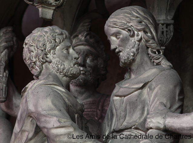 Judas, l’un des douze disciples, trahit le Christ. Il s’approche de lui pour l’embrasser, signe convenu pour le désigner : à cet instant, les gardes du temple et les soldats de Pilate se saisissent de Jésus et l’arrêtent. Sur la gauche de la scène, Pierre brandit son épée (dont la lame a disparu) et va trancher l’oreille du serviteur du grand-prêtre recroquevillé à ses pieds. L’échange des regards entre le Christ et Judas est intense (photo de droite). A la ceinture de Judas est accrochée la bourse aux trente deniers, prix de la trahison.
