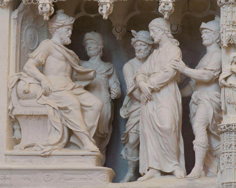 « Les chefs des prêtres et les anciens du peuple tinrent conseil contre Jésus pour le faire condamner à mort. Après l’avoir ligoté, ils l’emmenèrent pour le livrer à Pilate » procurateur romain de la province de Judée, seul juge pouvant condamner à mort. Jésus tenu par les gardes, poignets attachés, dans une attitude résignée, fait face à Pilate. Ce dernier, assis sur un trône surélevé, porte cuirasse et toge : insignes romains de sa charge ; sa tête n’est pas ici ornée d’une couronne de laurier selon la tradition, mais d’un turban, intrusion de l’Histoire dans l’iconographie au XVIe siècle (photo de droite).
