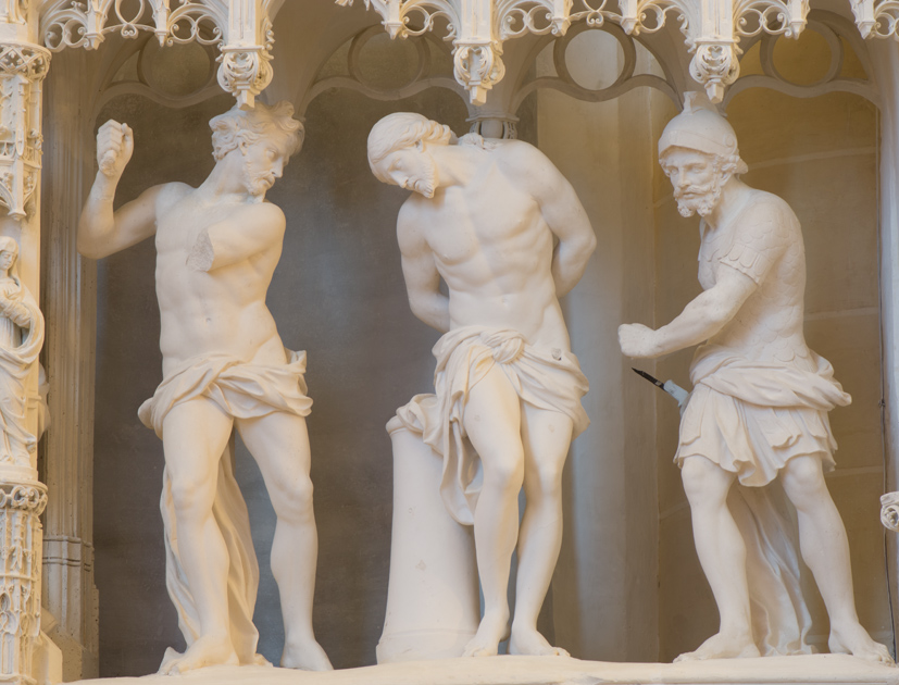Après avoir été condamné, Jésus est livré aux soldats pour être flagellé. Jésus est dépouillé de ses vêtements ; il est attaché à une colonne du prétoire et les bourreaux armés de fouets lui font subir le supplice. Ils sont ici représentés en pleine action : muscles tendus, buste tourné pour prendre de l’élan, bras levé pour s’abattre avec plus de force. Bien que détériorée, cette scène est d’autant plus émouvante que le sculpteur maîtrise parfaitement le rendu de l’anatomie des trois personnages et de leurs expressions (photo de droite).
