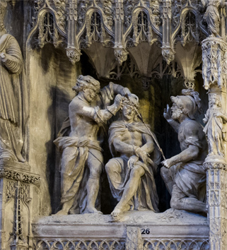 Par dérision au titre de roi des Juifs, les soldats revêtent le Christ d’un manteau rouge et posent sur sa tête une couronne d’épines qu’ils ont tressée. "...Puis ils se mirent à lui faire des révérences : salut, roi des Juifs ! Ils lui frappaient la tête avec un roseau, crachaient sur lui…" écrit l’évangéliste Marc. Comme pour la scène de la Flagellation, le groupe sculpté se résume ici à trois personnages. Le Christ est assis au centre, mains liées, visage baissé, résigné, entre un bourreau qui, protégé par des gants de fer (photo de droite), le coiffe de la couronne d’épines, et un soldat qui a gardé son casque et brandit un roseau.