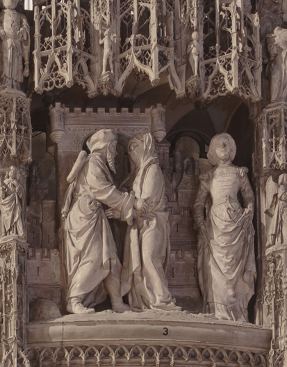 Le sculpteur répond aux termes du contrat : « En la tierce (image) sera figurée la ville de Jérusalem et en une des portes qui sera dite la porte dorée arriveront Anne et Joachim l’un d’un côté et l’autre de l’autre et derrière Joachim un lévrier (disparu) et du côté d'Anne sa chambrière ». Jérusalem est représentée comme une ville médiévale ceinte de remparts crénelés. L'échange des regards entre les époux est empreint d'une grande tendresse (photo de droite).