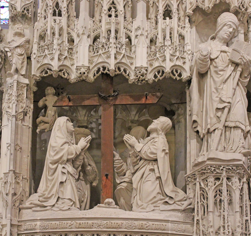 Parce que la hauteur des niches était insuffisante pour placer une croix dressée, le parti a été pris de représenter l’érection de la croix, sujet traité par le peintre Rubens un siècle plus tôt (cathédrale d’Anvers). Dix personnages occupent l’espace qui s’étend sur la longueur de deux niches. Deux groupes composent la scène : à gauche, soldats et bourreaux redressent la croix où est cloué le Christ ; à droite, Marie est soutenue par saint Jean et une sainte femme ; Marie-Madeleine, que l’on identifie à sa longue chevelure, s’agenouille, mains jointes. L’intensité dramatique et physique de l’instant se lit sur le visage souffrant du Christ et dans l’effort musculaire déployé par les bourreaux ; à celle-ci, répond l’intensité de la douleur morale de la Vierge et de ceux qui l’accompagnent.