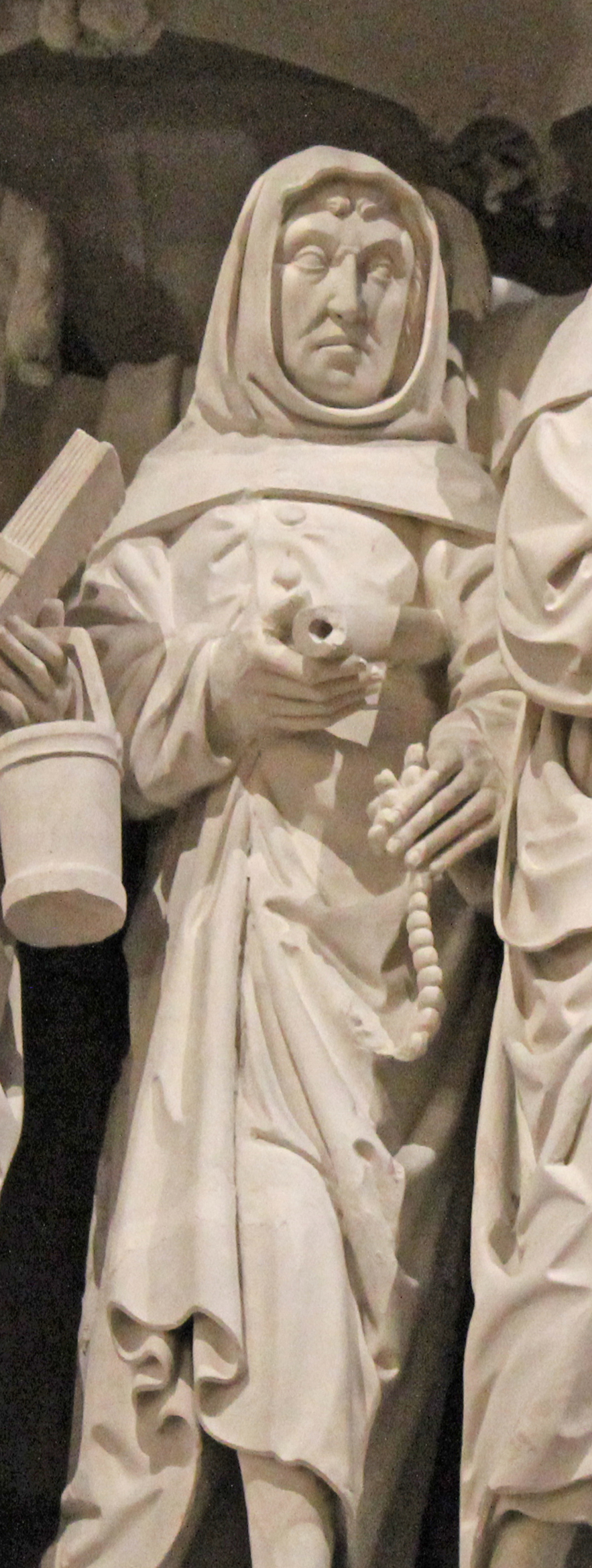 Le cercueil est porté par les apôtres qui apparaissent tous affligés. L’apôtre placé à gauche tient un livre de prière et un bénitier, un autre égrène son chapelet. Dans un espace très restreint, le sculpteur est parvenu à mettre en scène un grand nombre de personnages donnant l’impression de la progression d’un cortège. Comme pour la mort de Marie, aucun texte canonique n’évoque cet évènement. Mais les textes apocryphes et la Légende dorée ont fourni à l’iconographie chrétienne matière à accompagner la ferveur des fidèles.