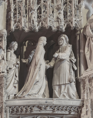 Marie rend visite à sa cousine Élisabeth enceinte de Jean-Baptiste ; quand Élisabeth entendit la salutation de Marie, l’enfant tressaillit en elle. La différence d’âge entre Élisabeth femme d’âge mûr et la toute jeune Marie se lit autant sur les traits des visages que dans la façon dont chacune est vêtue (photos de droite).
